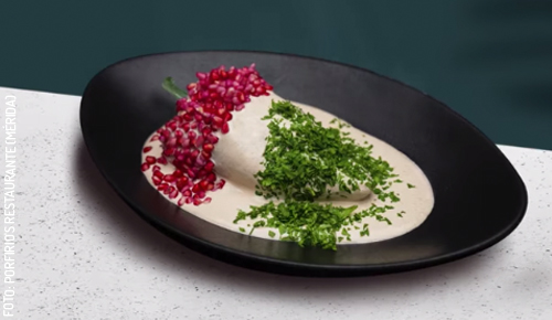 El platillo que celebra nuestra historia, preparado con esmero: chile poblano relleno de un guiso tradicional, cubierto con una nogada suave y delicada, coronado con granada y perejil.