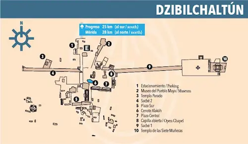 Dzibilchaltún high resolution map is one of the most used by local, national, and foreign travellers to explore the amazing archeological site. You will be able to find: