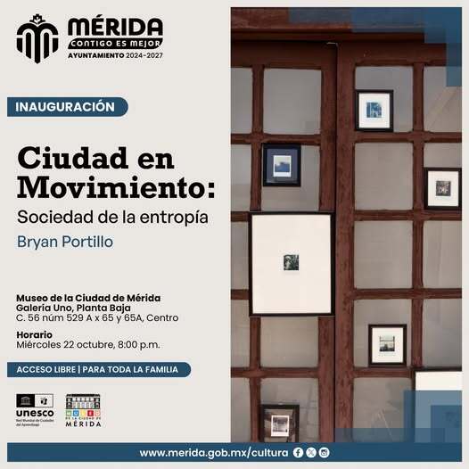 On October 22 at 8 pm, visit the Museum of the City of Mérida for the opening of Bryan Portillo’s new photography exhibition, “City in Motion: Society of Entropy”, at Gallery One on the ground floor.