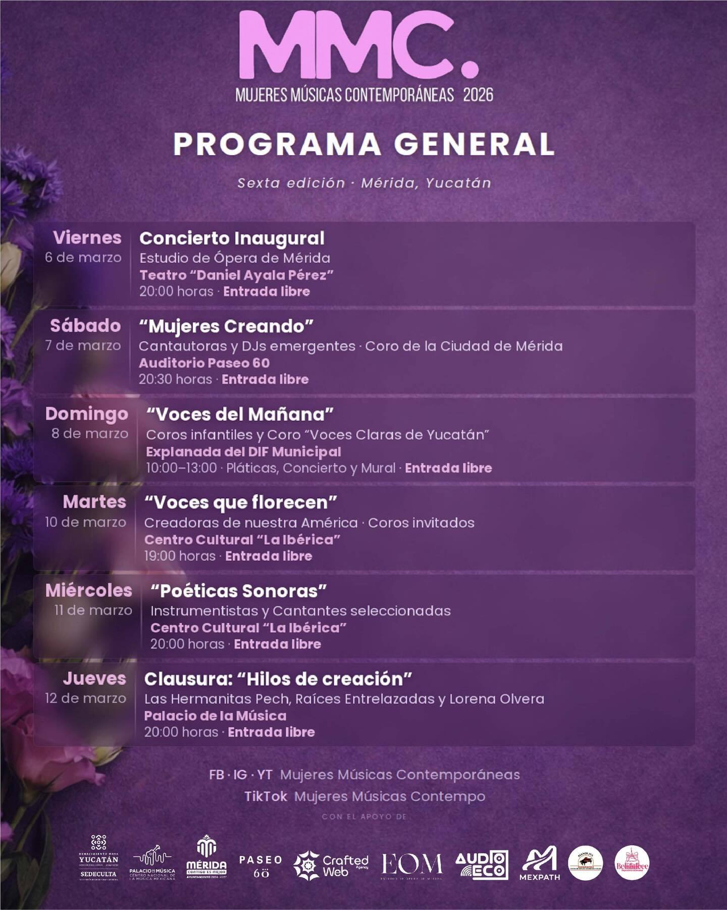 The program concludes on March 12 with the concert “Threads of Creation”, featuring Las Hermanitas Pech, Raíces Entrelazadas, and Lorena Olvera at Palacio de la Música - Centro Nacional de la Música Mexicana at 8 pm.