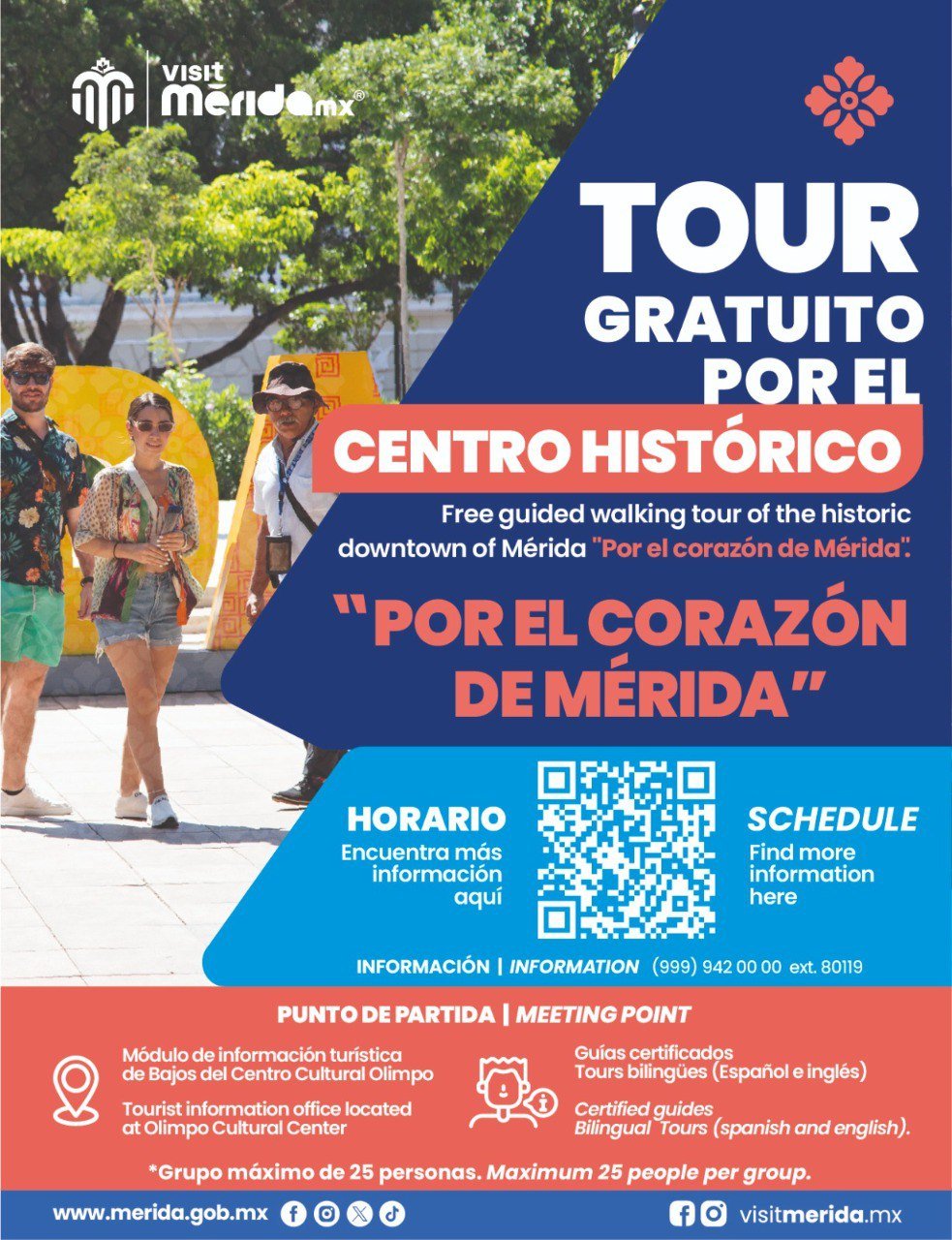 From Monday to Saturday at 9:30 am, with an additional schedule at 6 pm from Thursday to Saturday, don’t miss the free bilingual tours organized by the City Hall through the historic downtown: “Por el corazón de Mérida (Through the Heart of Mérida).” Guided by certified experts, explore the city’s most iconic spots: from the City Hall and Casa Montejo to the San Ildefonso Cathedral, the Government Palace, and Parque de Santa Lucía, where the tour concludes.