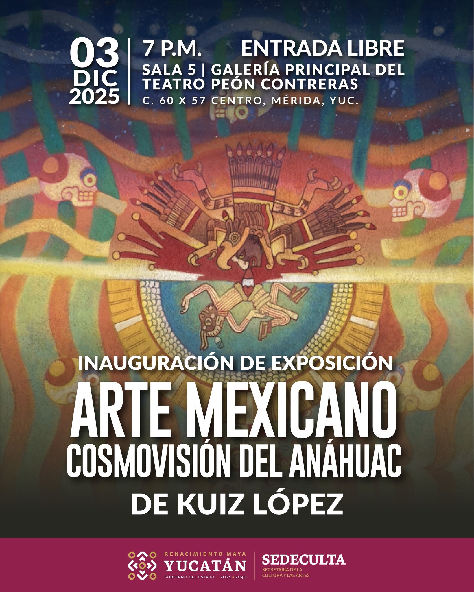 Este 3 de diciembre a las 7 pm, no te pierdas la inauguración de Arte mexicano. Cosmovisión del Anáhuac, de Kuiz López, en la Galería Principal del Teatro Peón Contreras como parte del Otoño Cultural 2025.