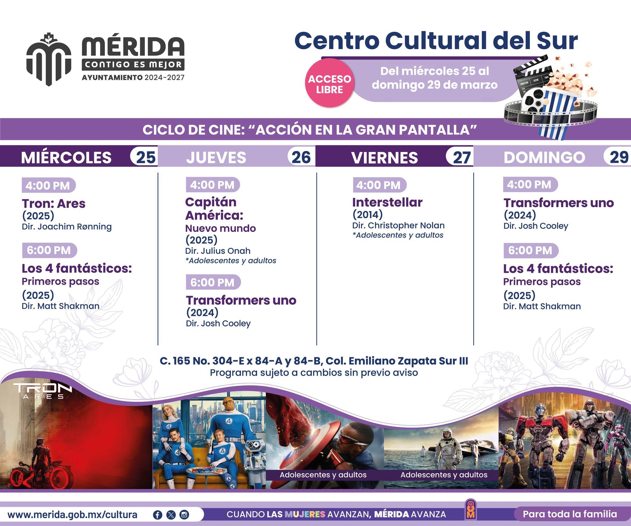 La programación arranca el 25 con funciones a las 4 pm y 6 pm, y continúa los días siguientes con títulos que van del sci-fi a los superhéroes. Entre las películas que podrás ver están Tron: Ares, The Fantastic Four, Captain America: Brave New World, Transformers One e Interstellar. Además, algunas funciones se repiten el domingo 29, ideal si no alcanzaste a ir entre semana.