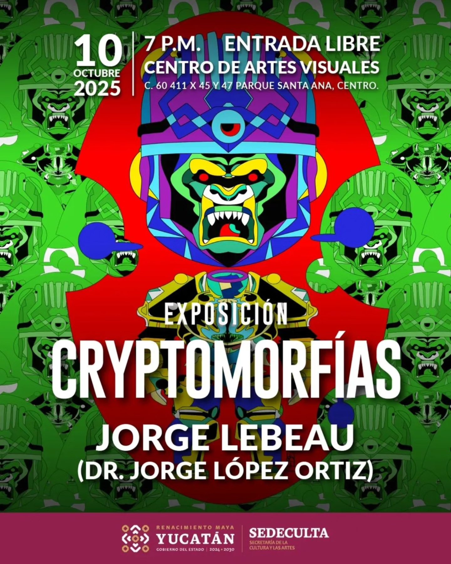 Este 10 de octubre a las 7 pm, el Centro de Artes Visuales de la Sedeculta dará inicio a su nueva temporada de arte contemporáneo con la inauguración de varias exposiciones. Entre ellas se encuentra “Cryptomorfías” del artista Jorge Lebeau, en la Sala 1, donde sus figuras de monstruos geométricos cobran vida en un universo visual único.