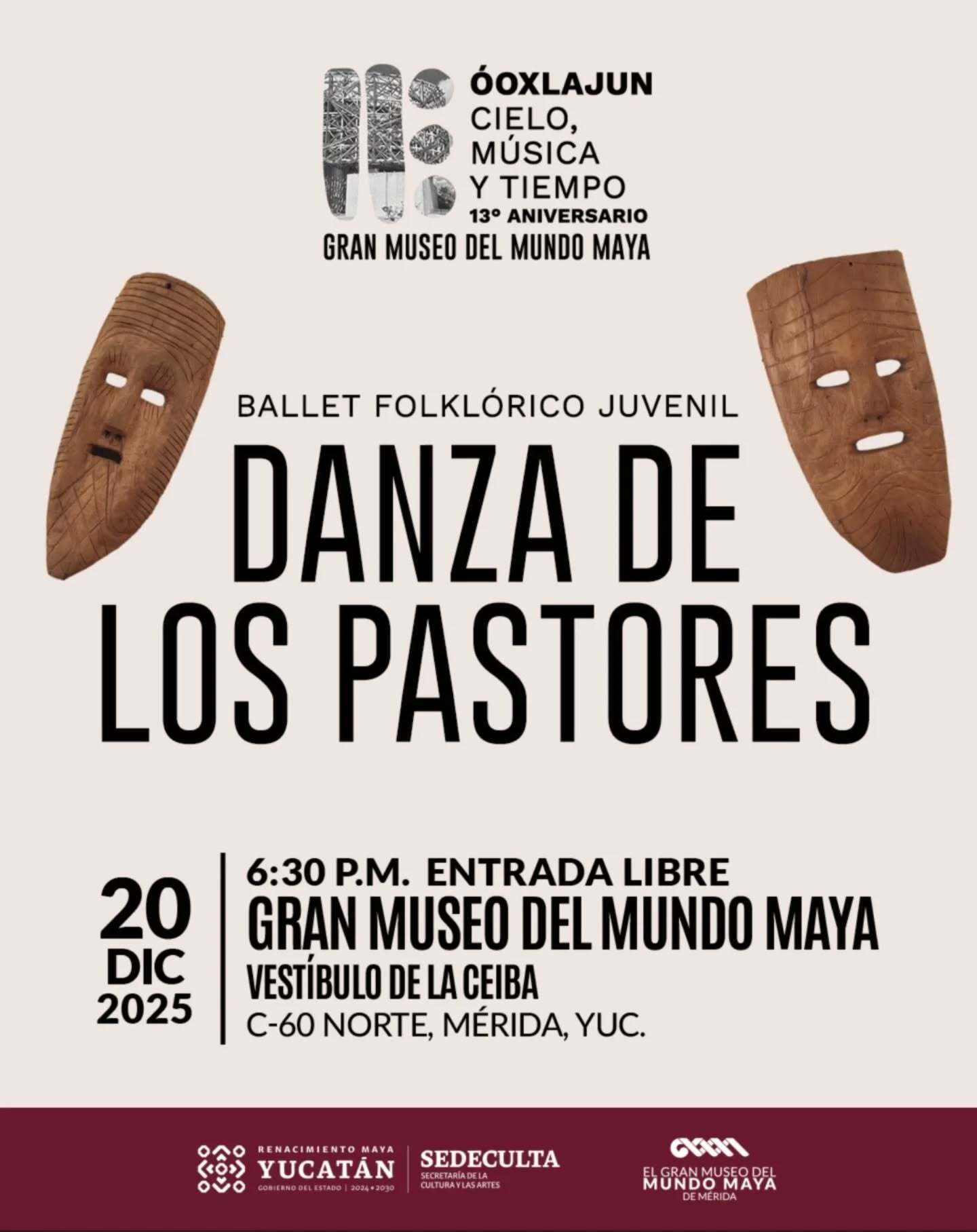 Este 20 de diciembre a las 6:30 pm, no te pierdas la presentación de la Danza de los Pastores a cargo del Ballet Folklórico Juvenil, como parte de la inauguración de Óoxlajun: Cielo, música y tiempo, en el marco del 13.º aniversario del Gran Museo del Mundo Maya. La función se realizará en el vestíbulo de la ceiba del museo y la entrada es gratuita.