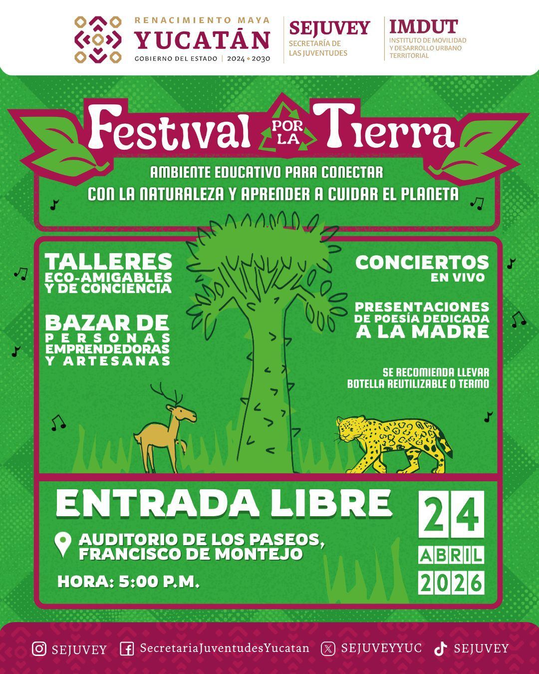 Este 24 de abril a las 5 pm, el Auditorio de los Paseos, en Francisco de Montejo, será sede del Festival por la Tierra, una jornada que reúne distintas expresiones en torno al cuidado del entorno.