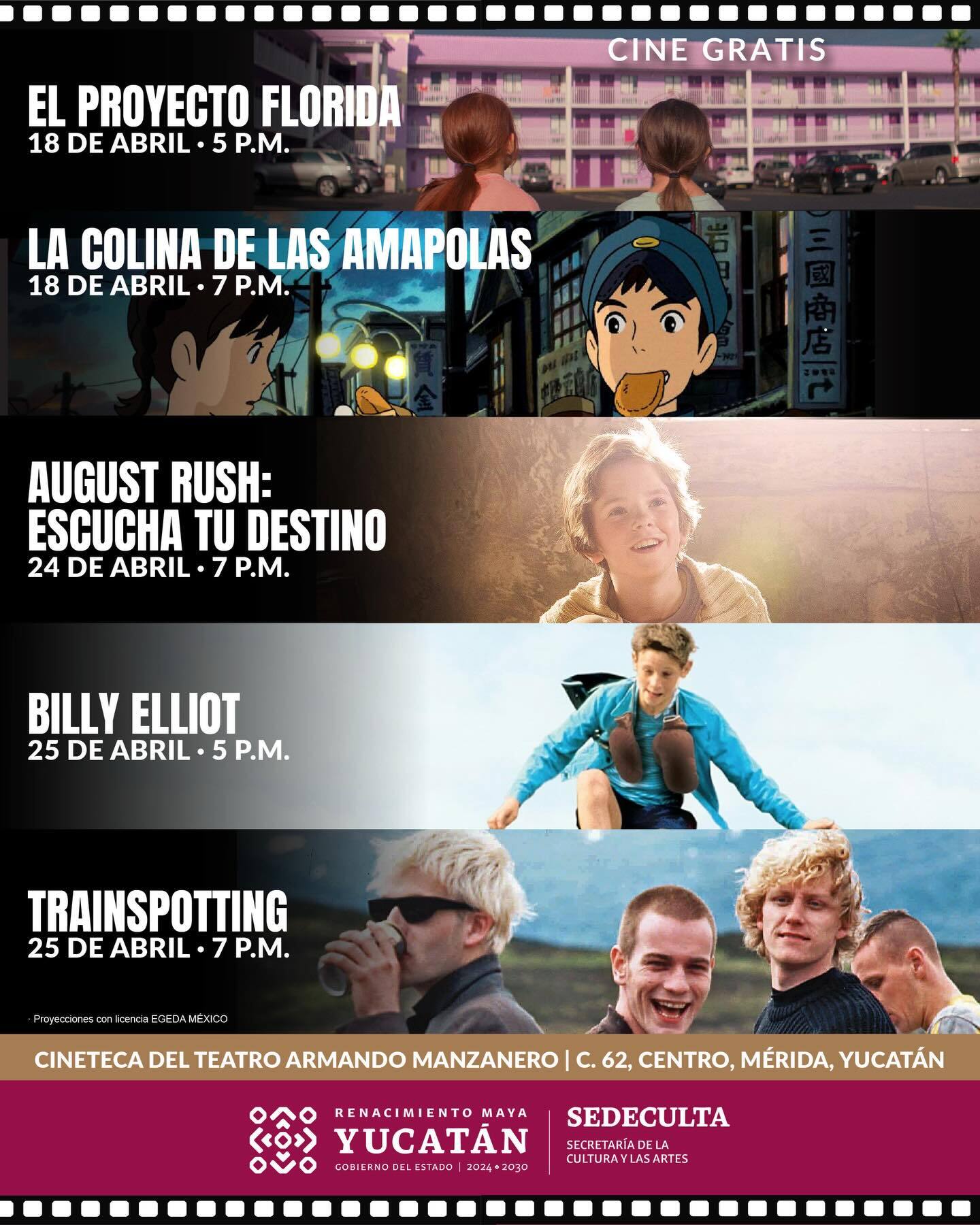 La programación inicia el 18 de abril con The Florida Project a las 5 pm y La colina de las amapolas a las 7 pm. El 24 de abril, a las 7 pm, se proyectará August Rush (Escucha tu destino). Finalmente, el 25 de abril podrás ver Billy Elliot a las 5 pm y Trainspotting a las 7 pm.