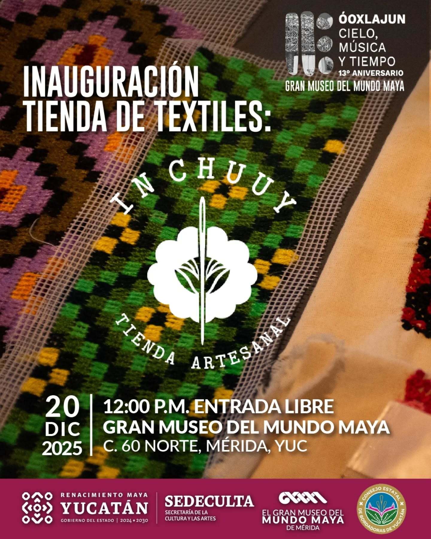 Este 20 de diciembre a las 12 pm se inaugura In chuuy, un espacio de venta de artesanías del Gran Museo del Mundo Maya en colaboración con el Consejo Estatal de Bordadoras. La tienda reúne textiles elaborados con distintas técnicas tradicionales del bordado maya yucateco. La entrada es libre.