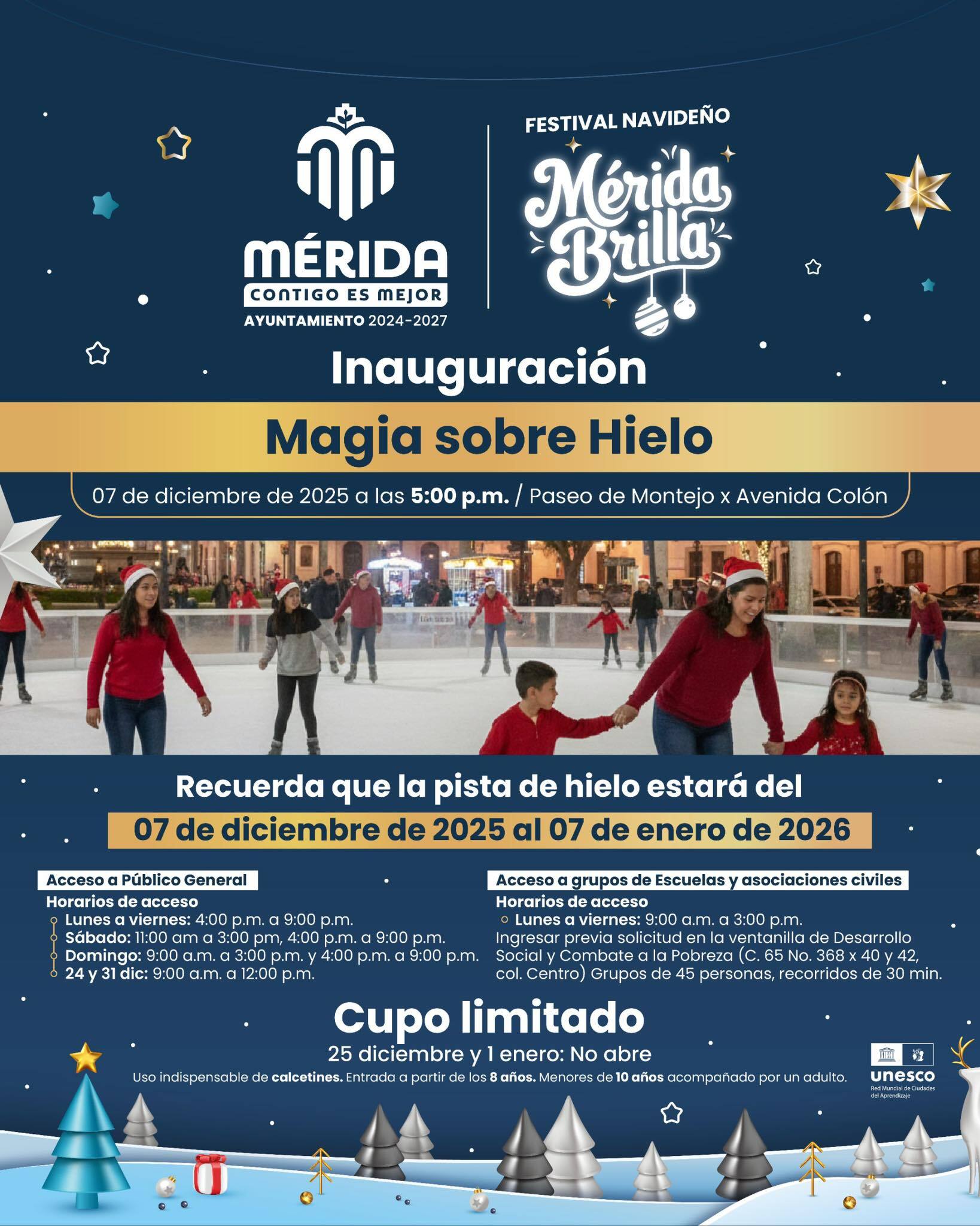 Del 7 de diciembre al 7 de enero, lánzate a vivir una de las experiencias más divertidas del Festival Navideño Mérida Brilla: Magia Sobre Hielo, una pista donde podrás patinar con familia y amigos en Paseo de Montejo x Avenida Colón.