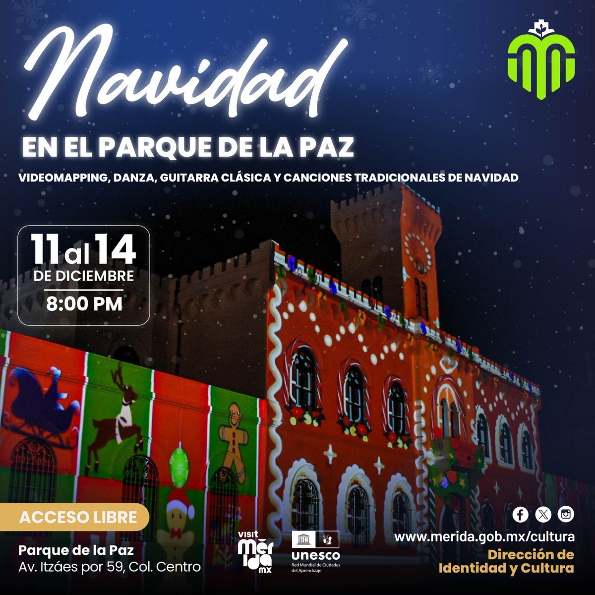 Del 11 al 14 de diciembre a las 8 pm, échate una vuelta al Parque de la Paz para disfrutar de un videomapping navideño gratuito, acompañado de danza, guitarra clásica y música que ya huele a temporada. Una linda forma de cerrar el día y dejarte llevar por el ambiente decembrino. ¡No te lo pierdas!
