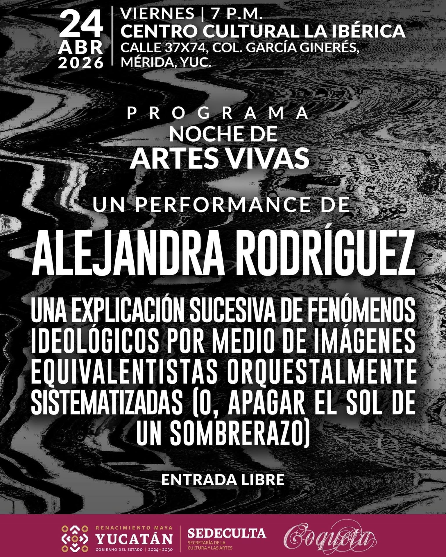 En esta ocasión, se presentará el performance de Alejandra Rodríguez, una pieza que retoma el impulso del Estridentismo para activar la memoria de este movimiento artístico desde el presente. A través de una propuesta conceptual y escénica, la obra abre un diálogo entre historia, ideología e imagen, explorando otras formas de experimentar y relacionarse con lo artístico.