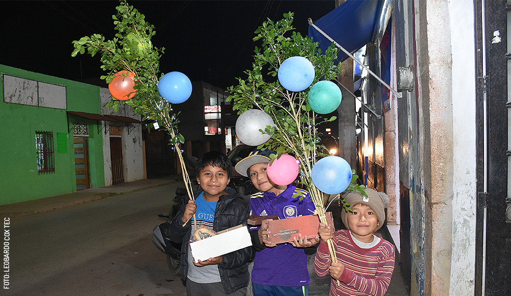La Rama Yucateca: Tradición navideña del sureste de México. Niños cantan villancicos con su altar de...
